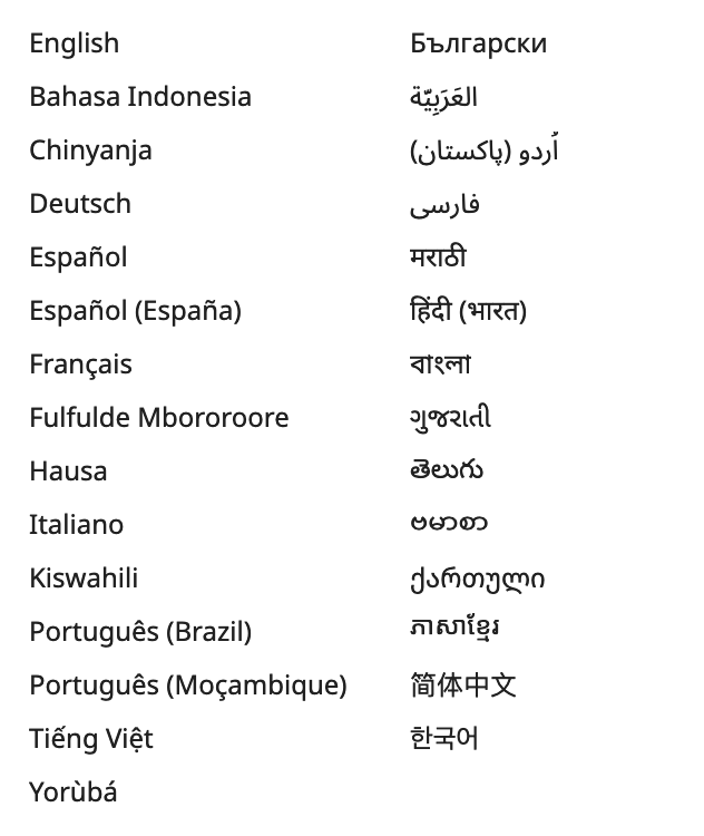 To work around this challenge, products in the Kolibri ecosystem use the open source typeface Noto Sans maintained by Google. Noto includes a wide range of fonts that cover an enormous number of languages, scripts, and glyphs.